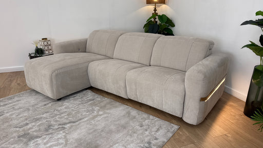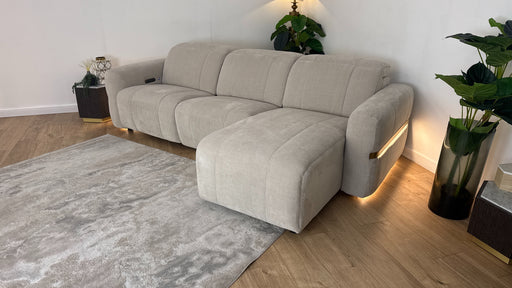 Original price £2,399Current price £1,699| /Sofology Lumiere Fabric 4 Seater Chaise Power Recliner/Headrest Gold Trim in Relaxed Chenille Cotton