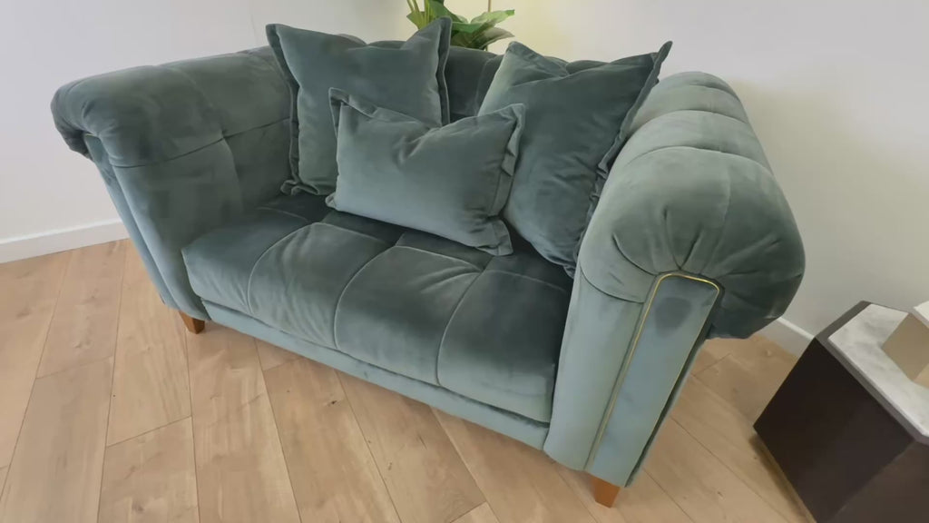 Sofology Midsummer Fabric Loveseat Gold Trim in Day Teal Mix