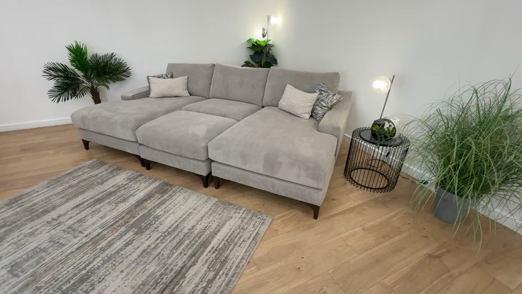 Sofology Wildwood Fabric 4 Seater Double Chaise with Footstool in Soft Sherpa Silver Contrast Piping